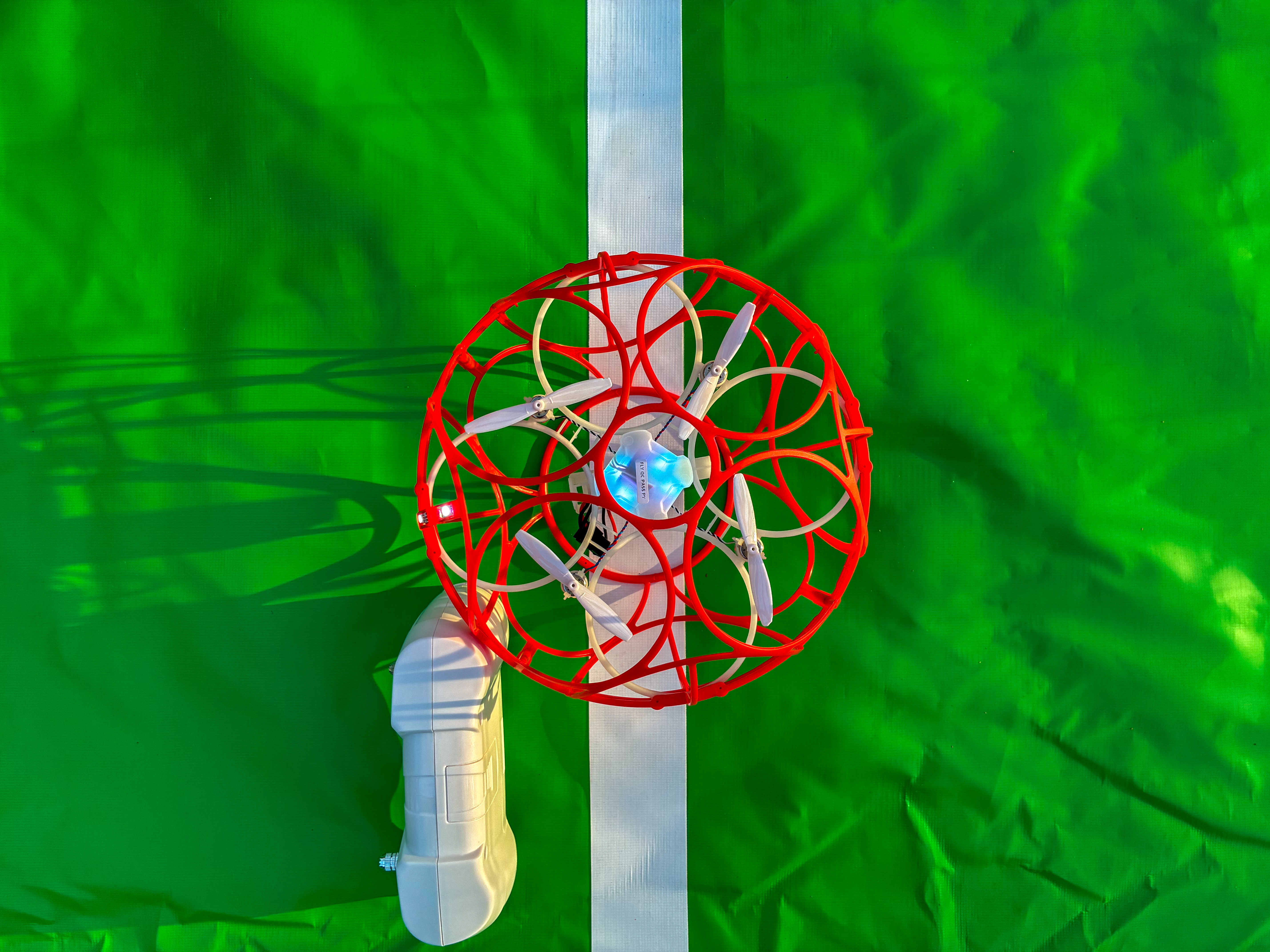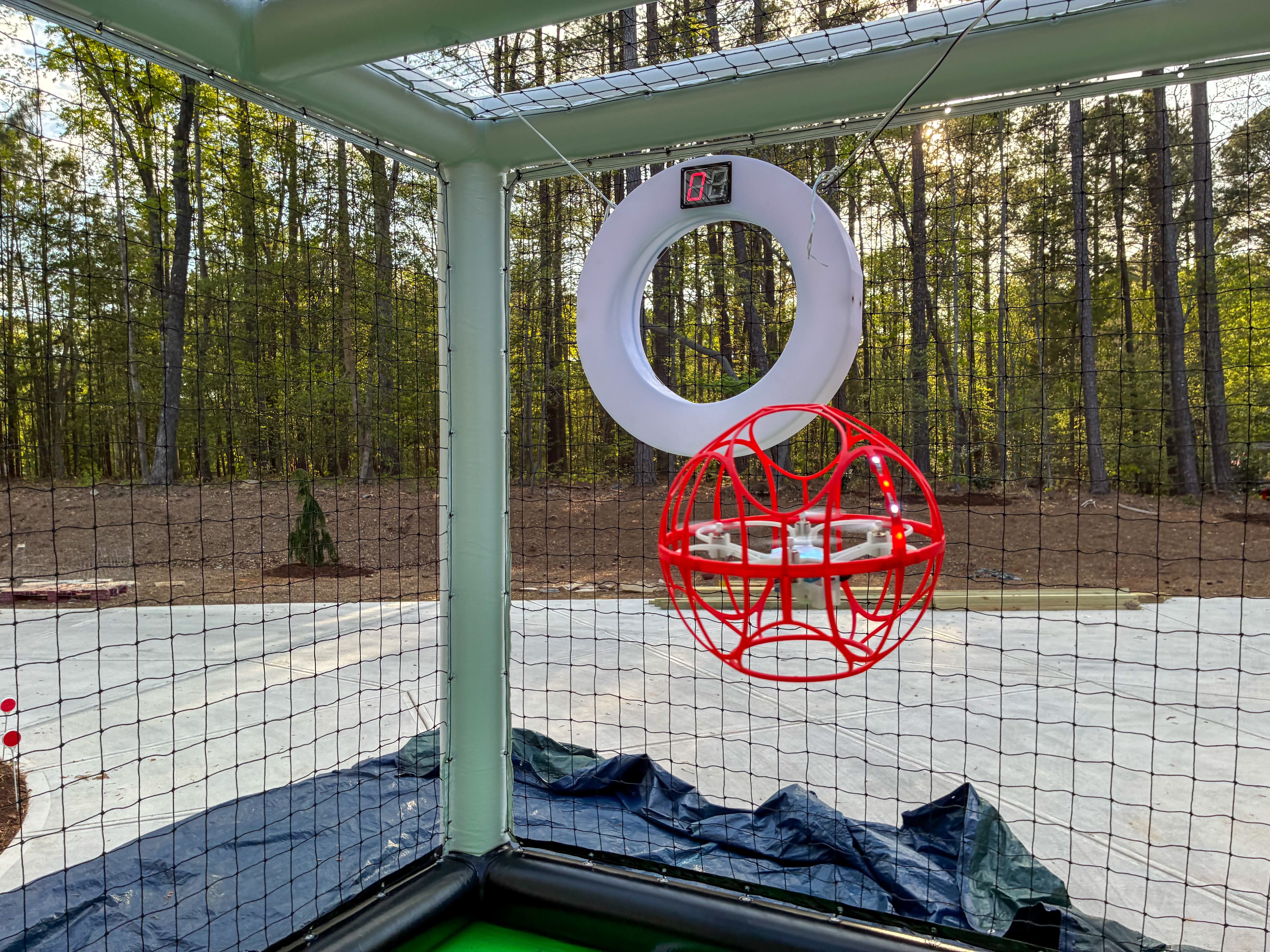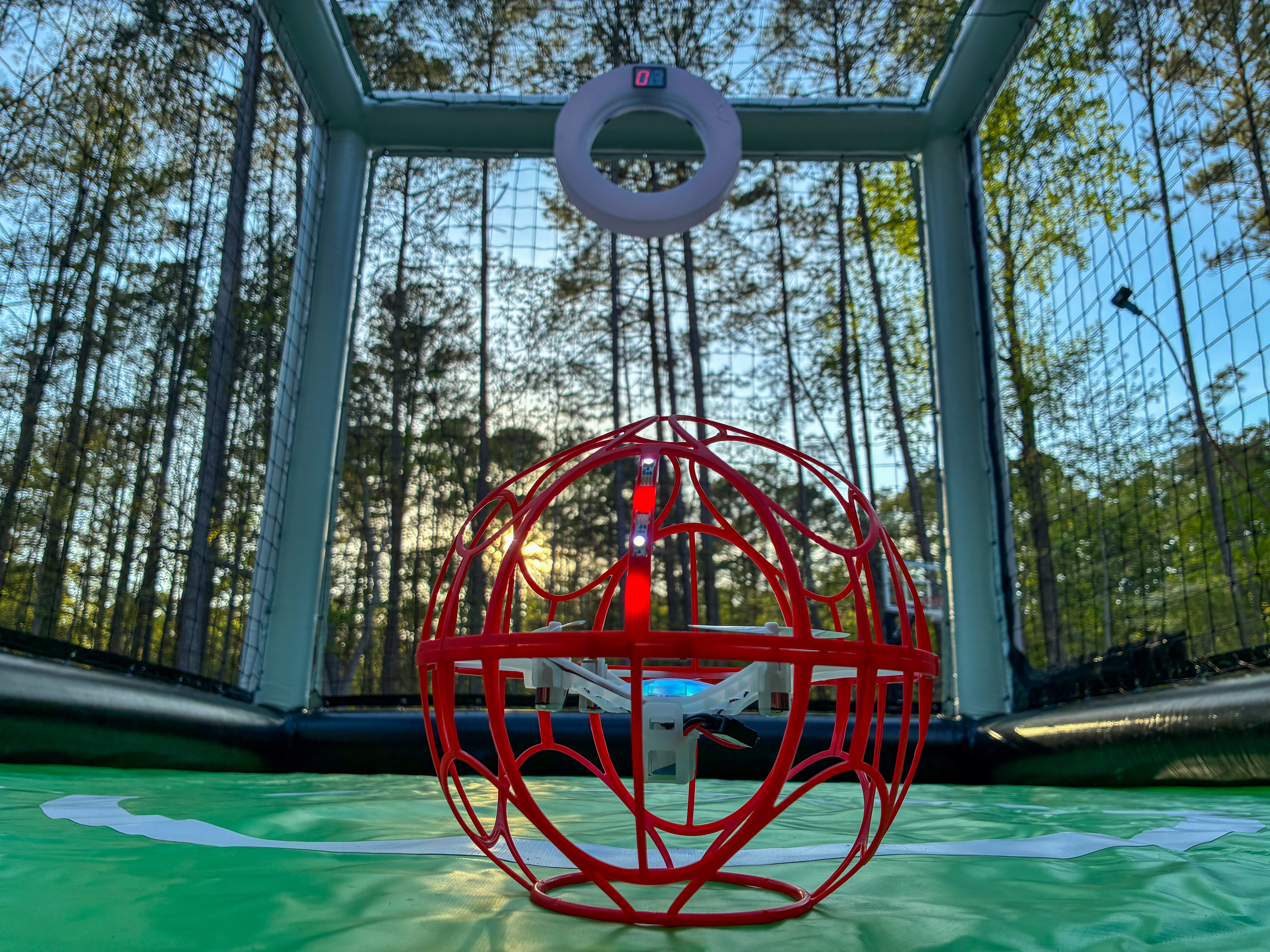 - Red spherical drone in front of a goal with a hoop