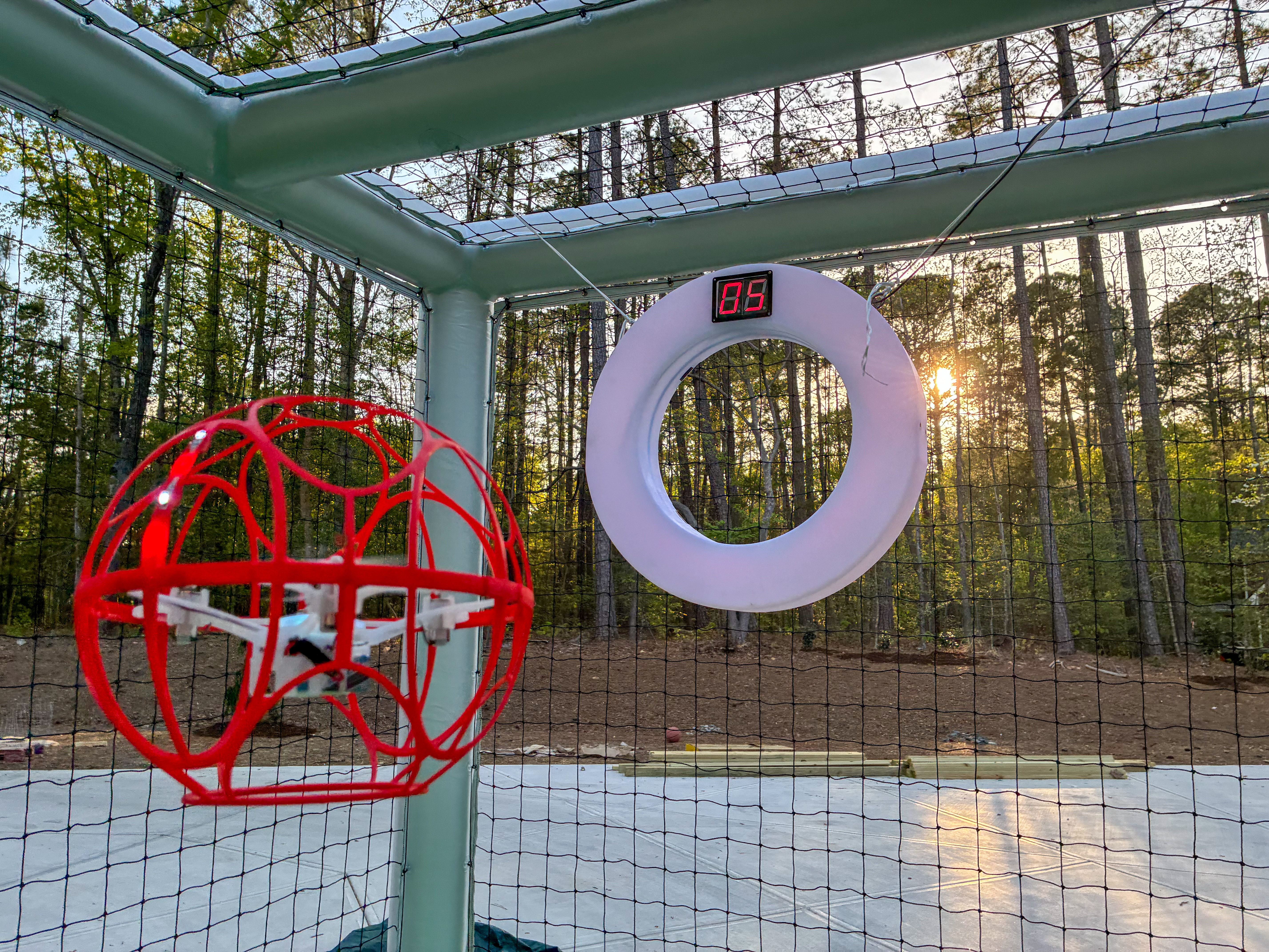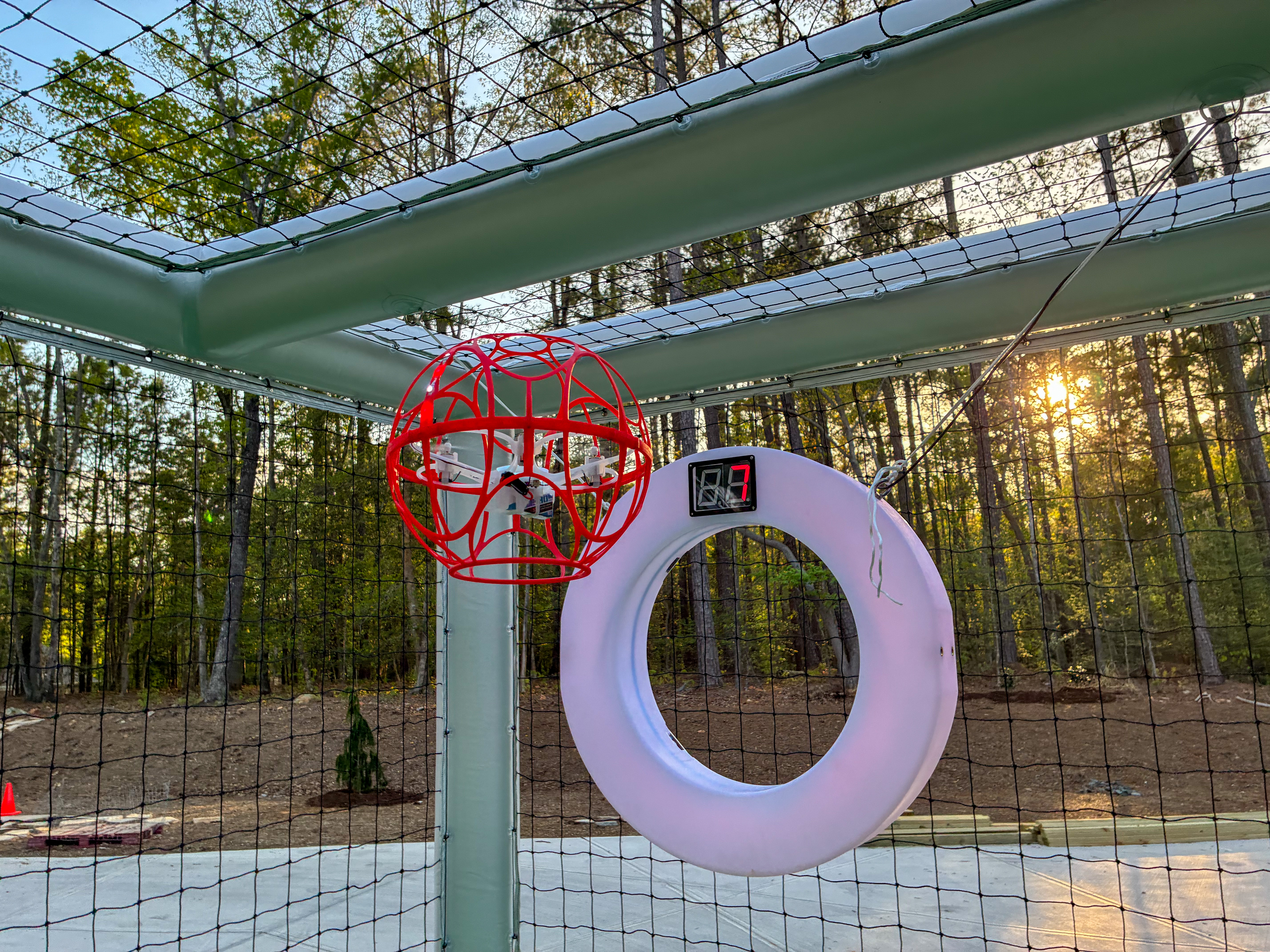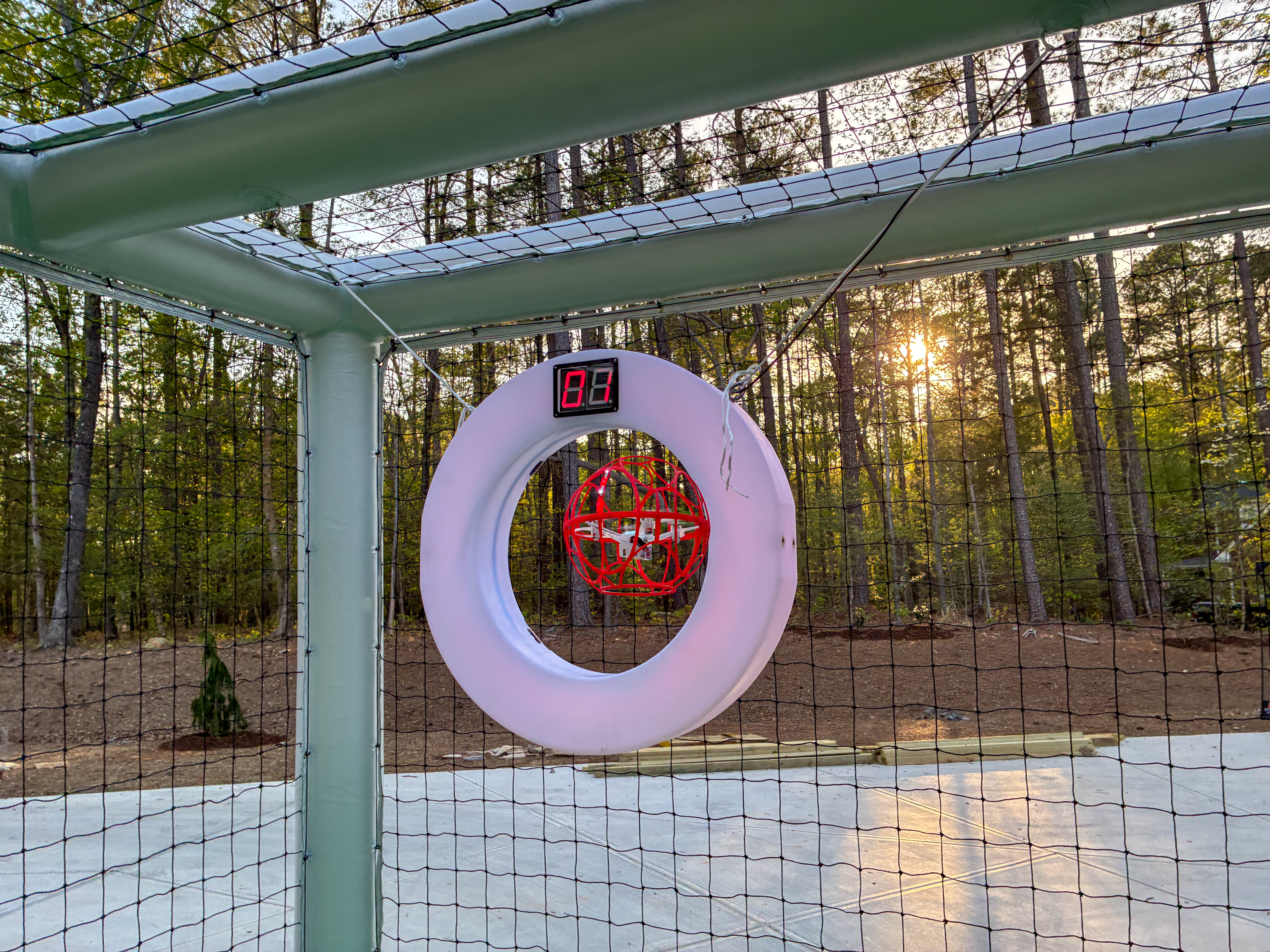 - Red spherical drone in front of a goal with a hoop