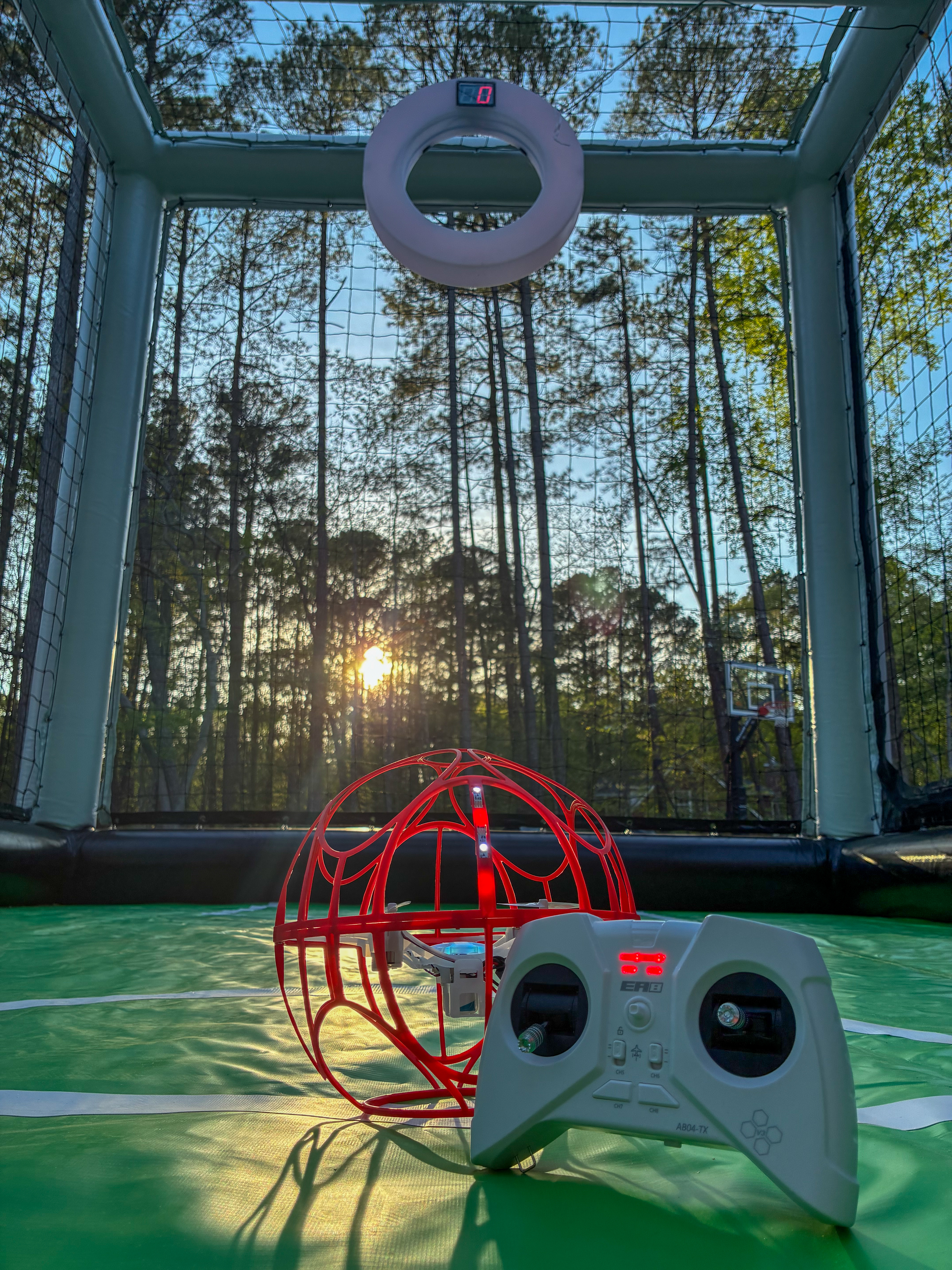 - Flying orb toy and remote control in front of a goal at sunset