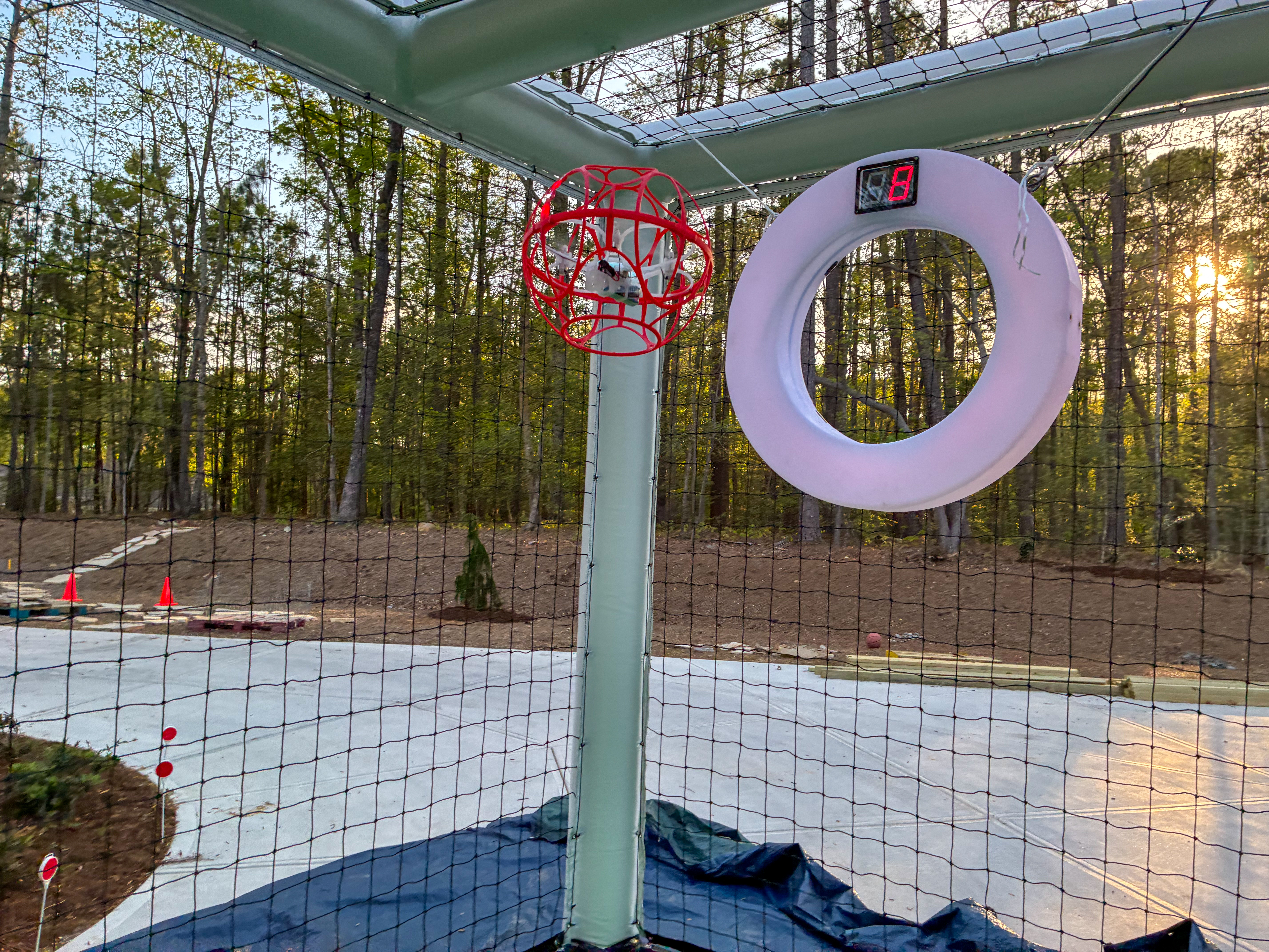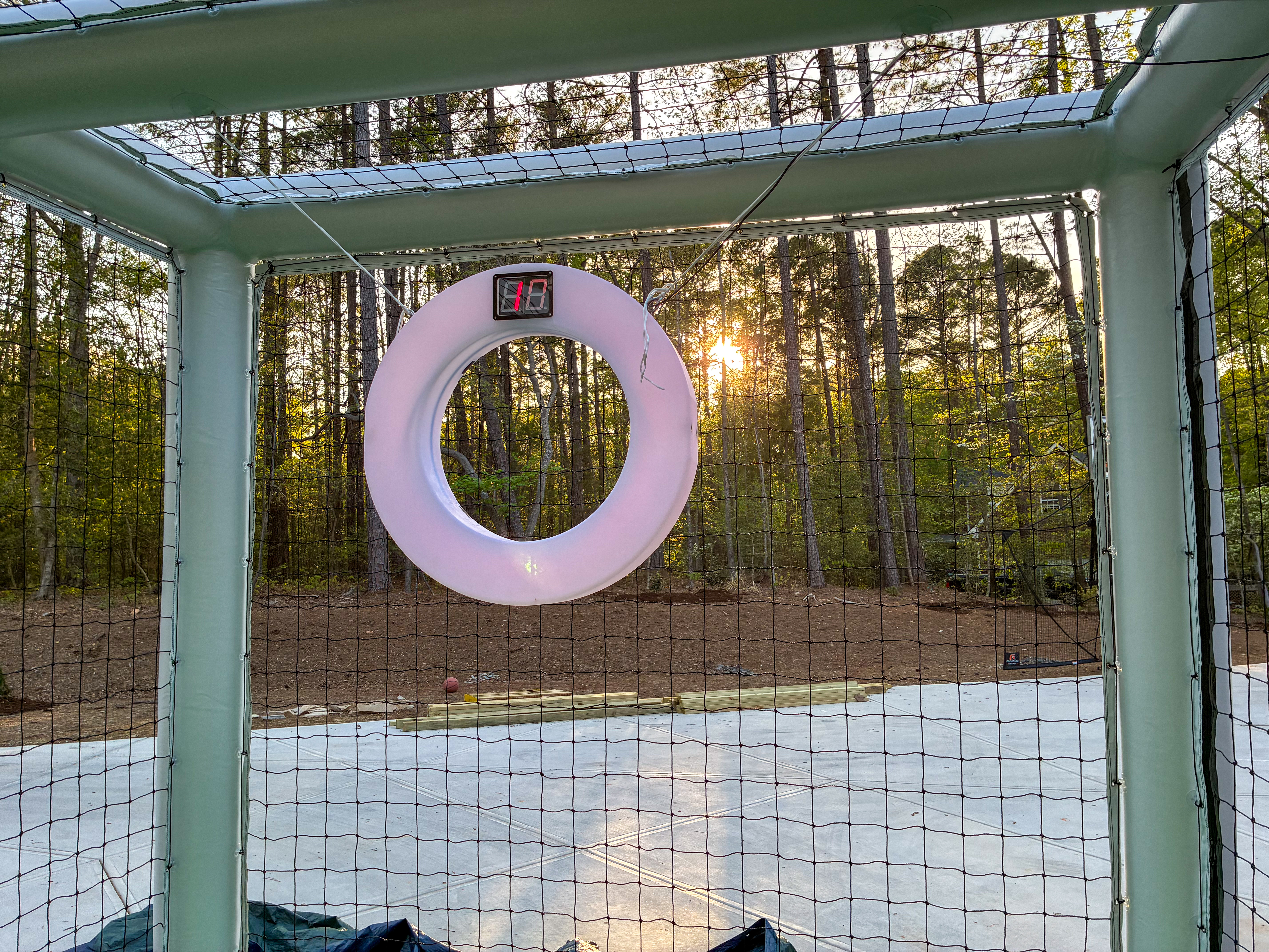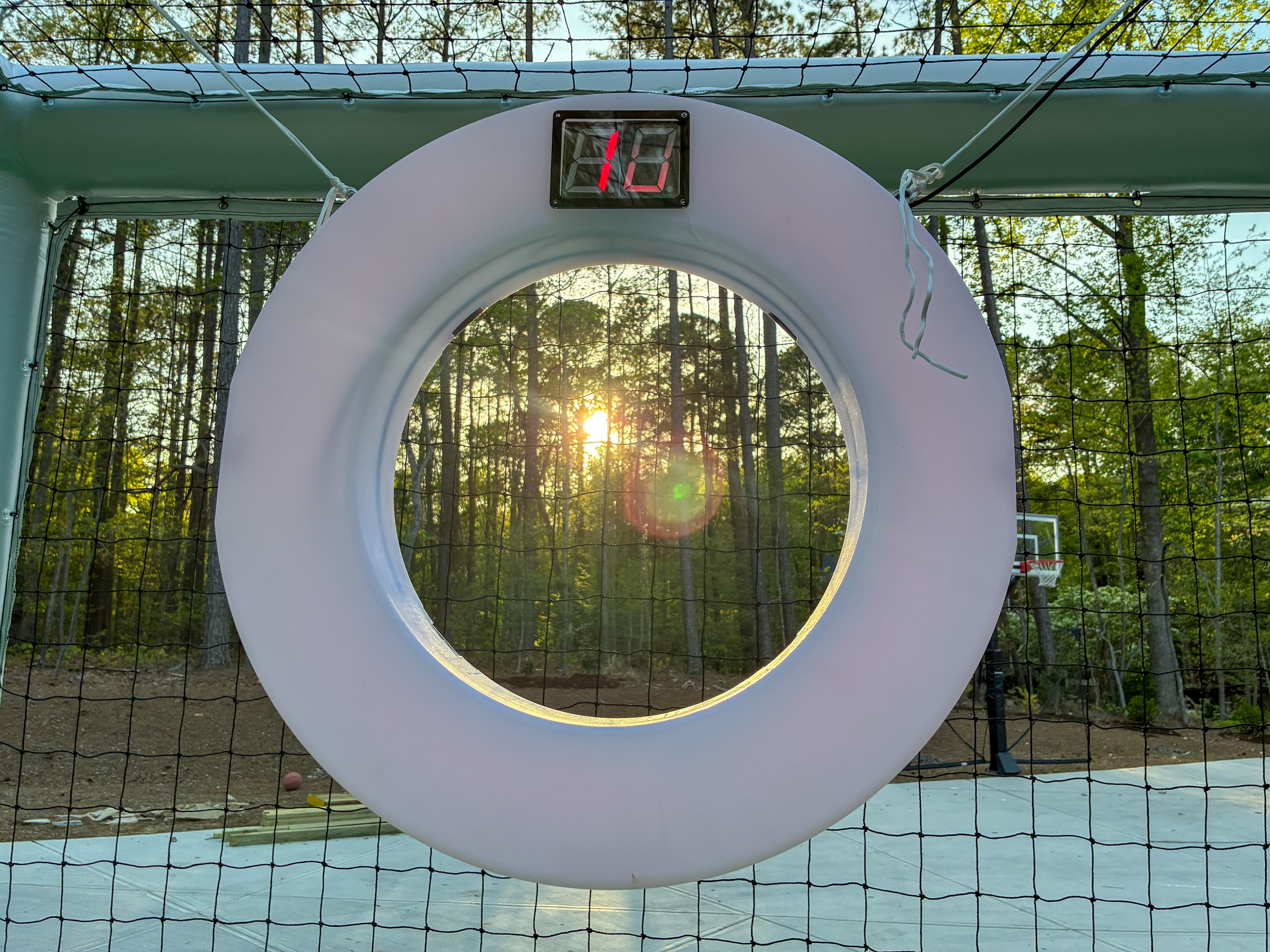 - Toy basketball hoop and white ring in outdoor enclosure at sunset