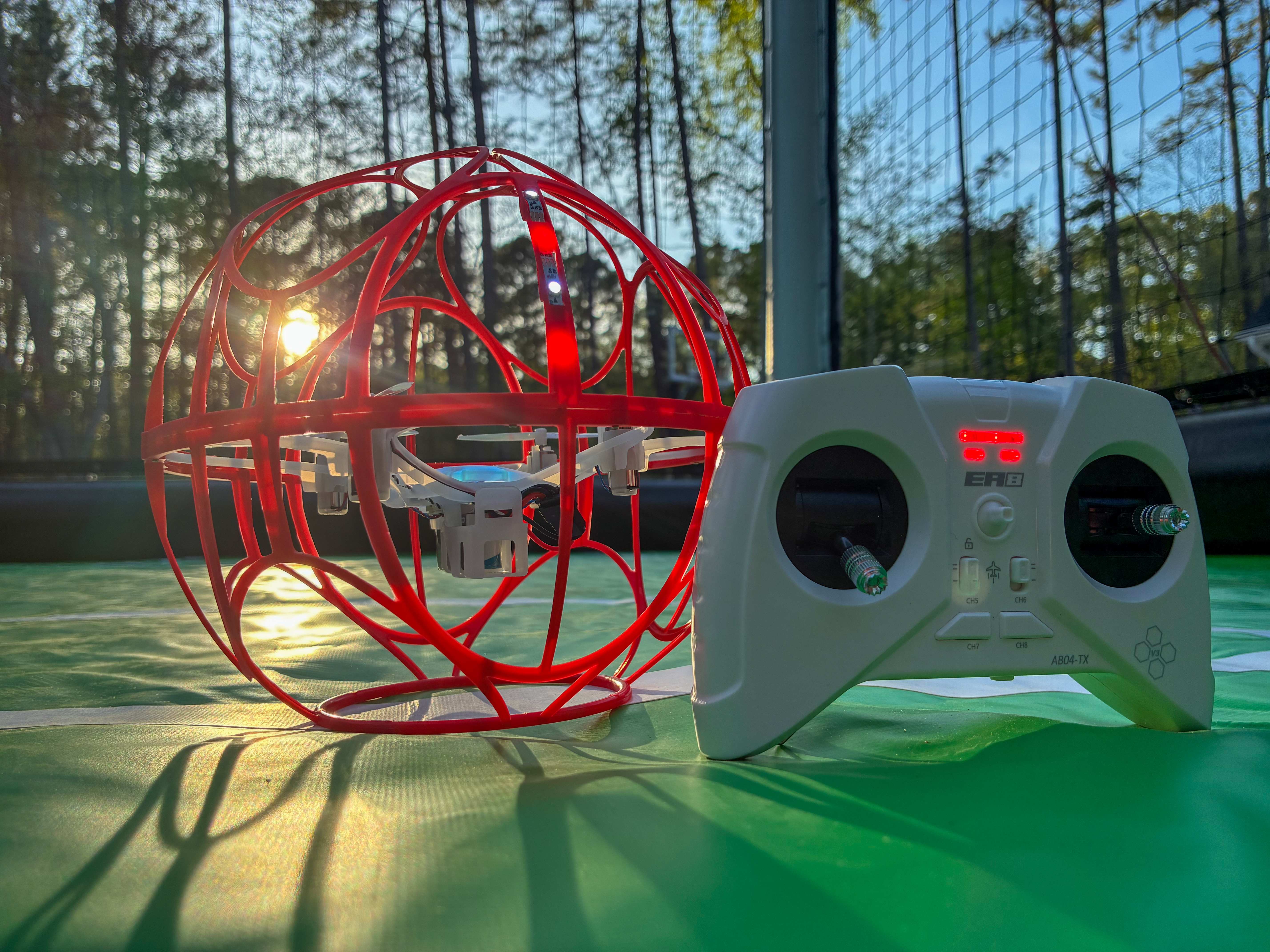 - Red caged drone and remote on green surface at sunset