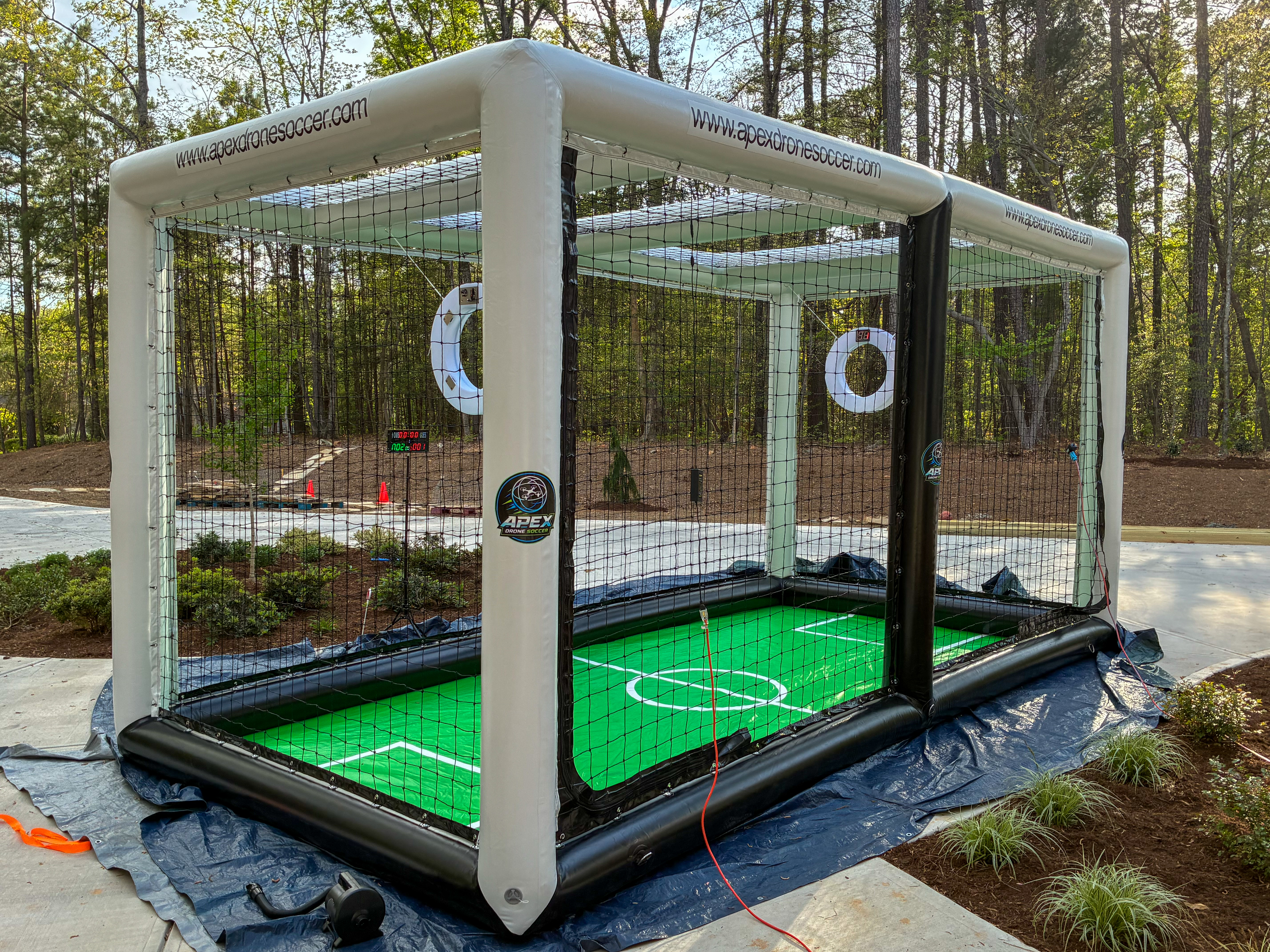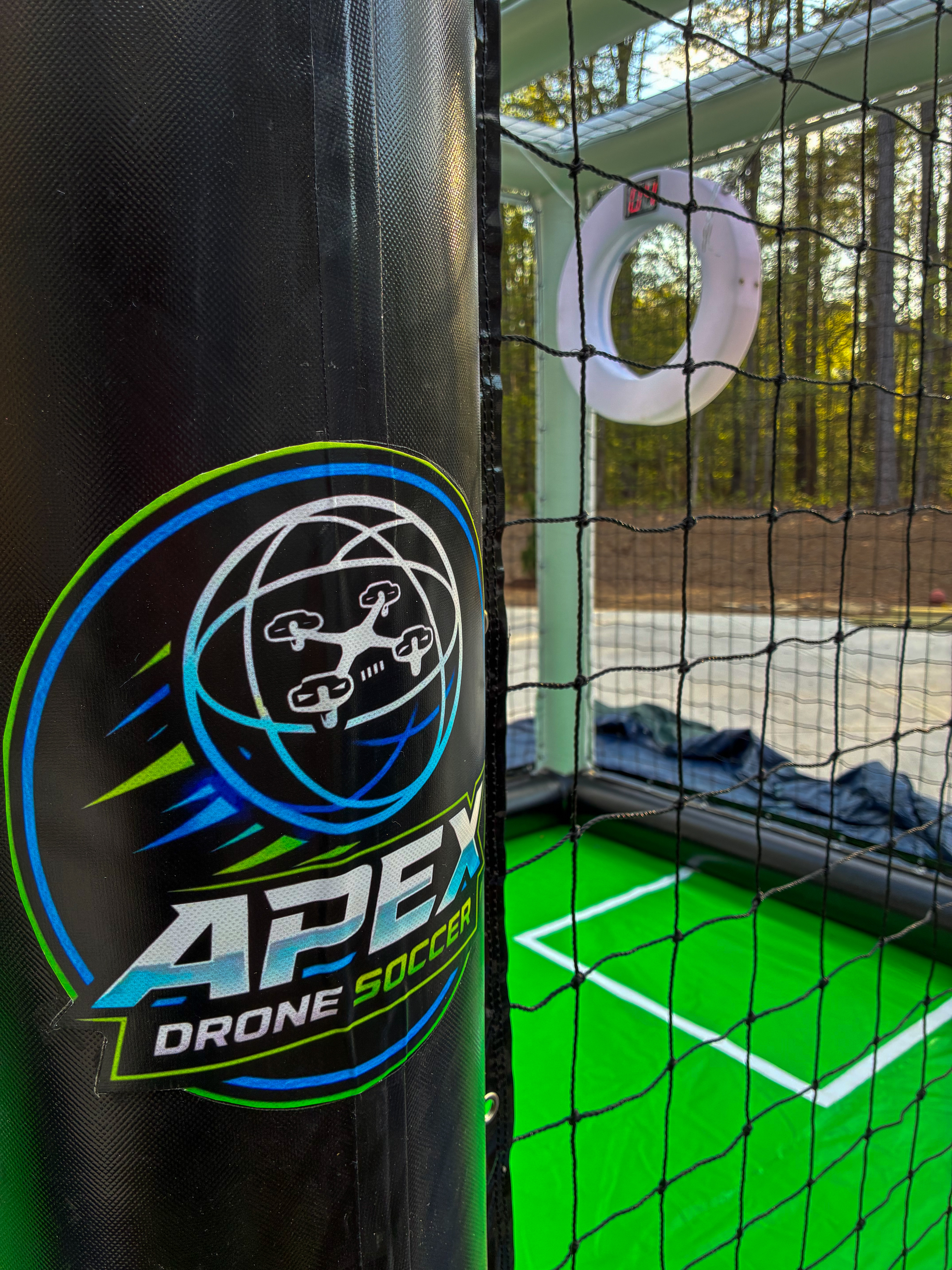 - APEX DRONE SOCCER logo, drone field, goal, and net