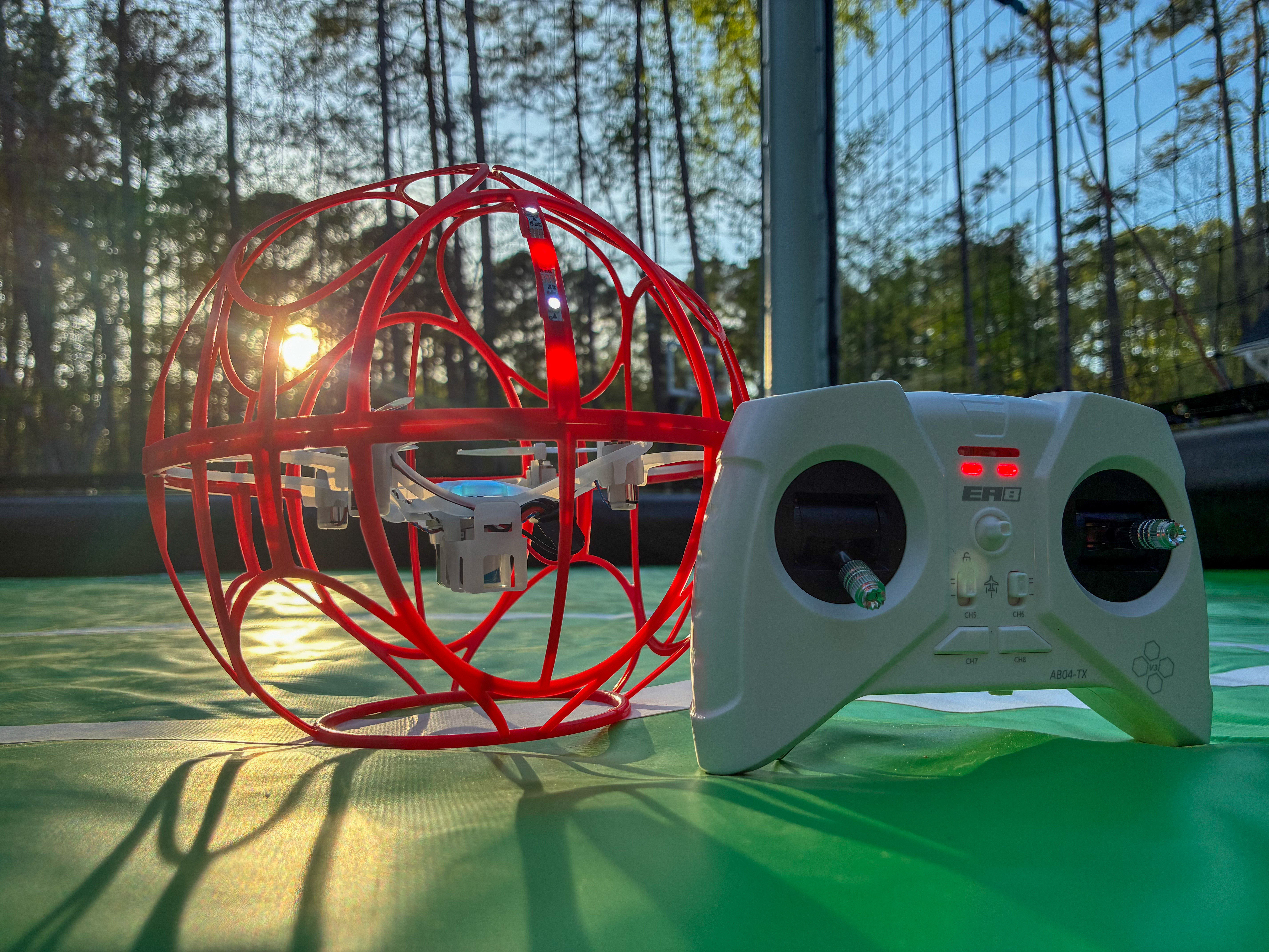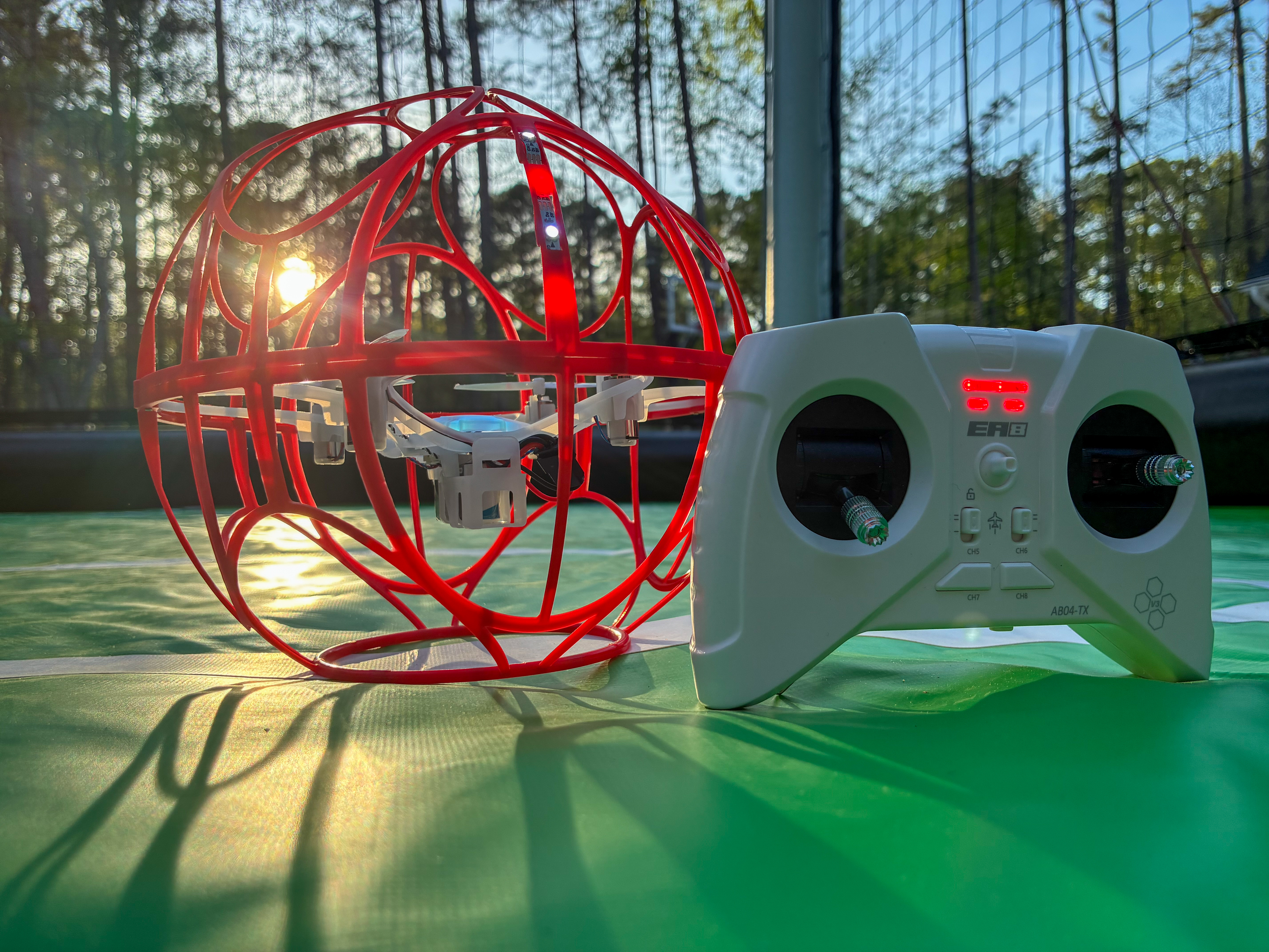 - Red spherical drone and remote on a green court at sunset