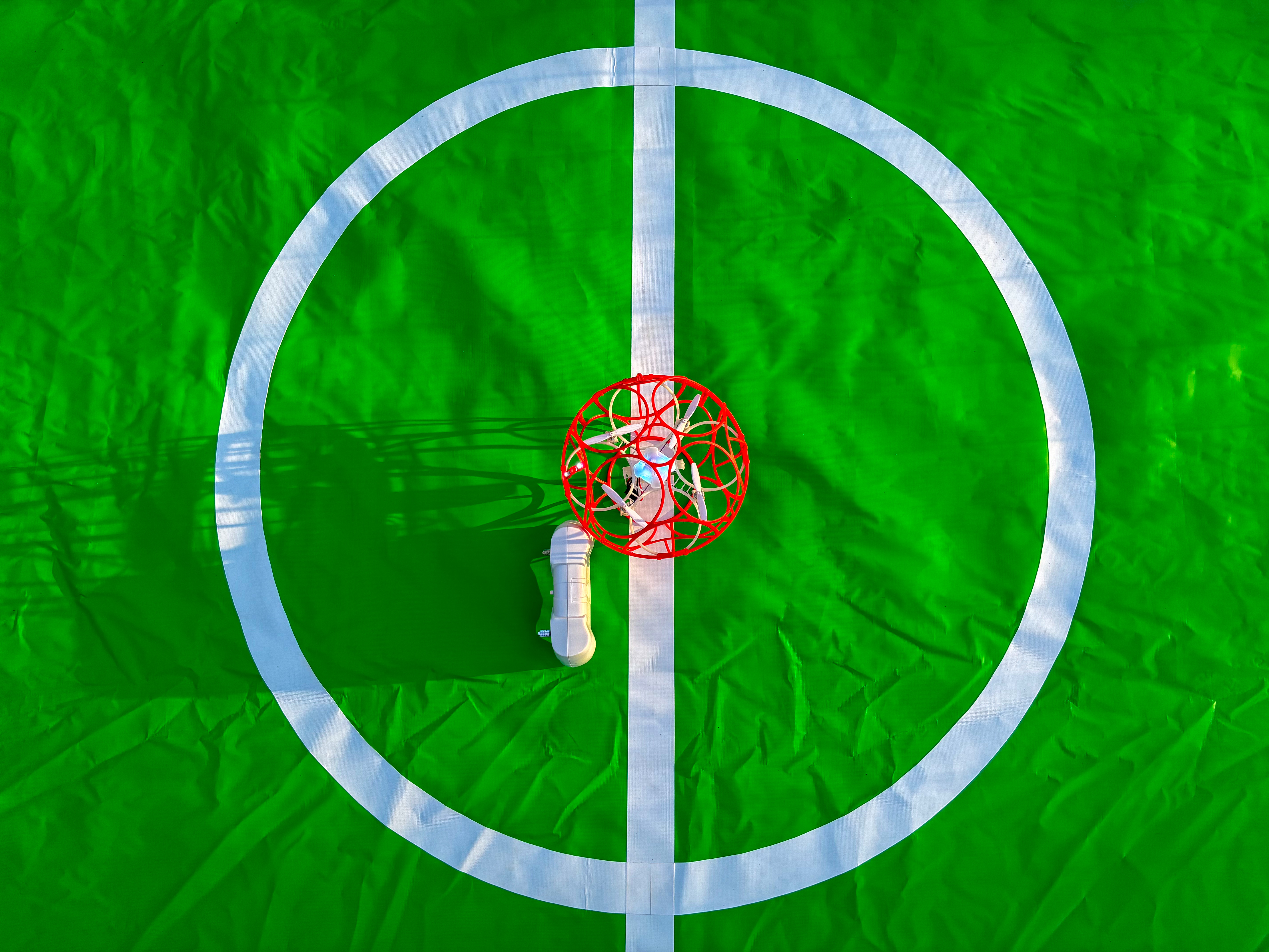 - Overhead view of drone with red cage on green field